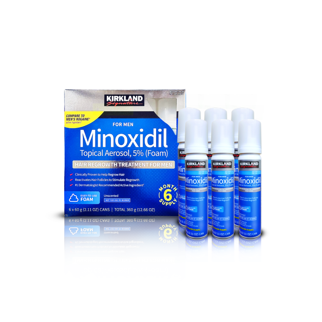 — 6 Frascos de Espuma Minoxidil Kirkland 5% (60 g c/u): Tratamiento premium para 6 meses.